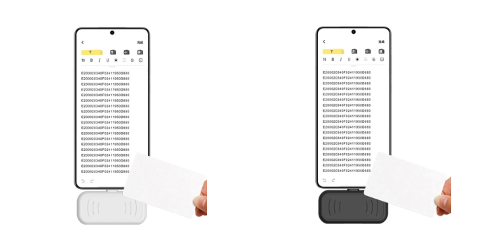 Operating mode:Type-C connects to the phone, receives data at the flashing cursor (notepad, memo, input box, etc.), and the output number is a 24-bit hexadecimal EPC number (supports customized output area and length)