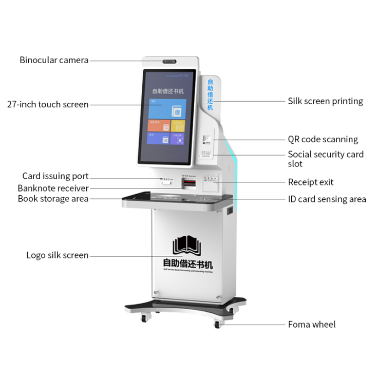 - 2 7- inch capacitive touch screen, with self-service borrowing and returning, card application software, can realize book borrowing and returning, reader query, renewal, self-service card application and other operations